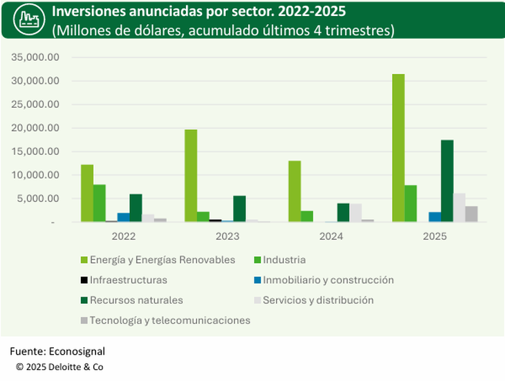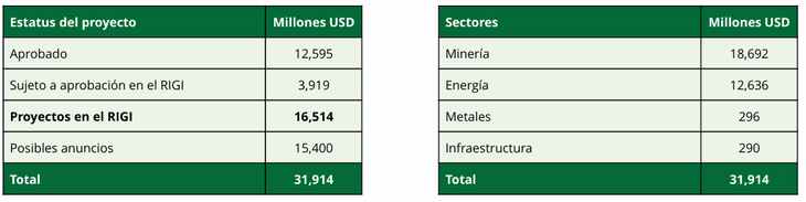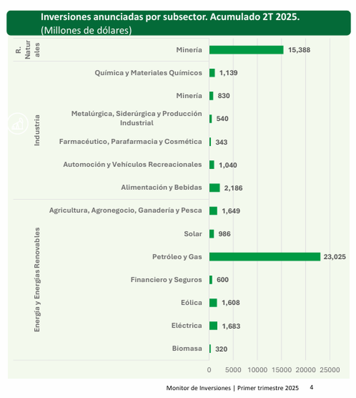 De acuerdo al conteo del estudio, los anuncios de inversión se han concentrado en los sectores de Energía, Recursos Naturales e Industria. Los principales subsectores son Petróleo y Gas, con 23 mil millones USD, Minería, con 15.4 mil millones USD, y Alimentación y Bebidas, con 2.2 mil millones USD.