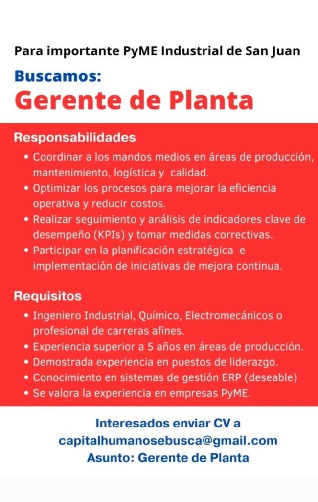 Perfil Industrial hacemos llegar a nuestros lectores las vacantes laborales que nos llegan desde las empresas. Este es un servicio gratuito que prestamos. Cualquier consulta debe comunicarse al correo o teléfono que aparece en el flyer. Para leer correctamente los datos haga clic en el flyer.