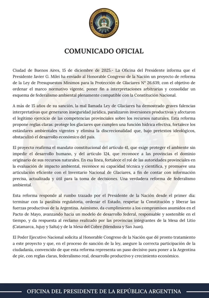 El gobierno del presidente Javier Milei envió al Senado la reforma a la ley de Glaciares, proyecto que, tal cual se venía adelantando, le da un fuerte poder a las provincias. En uno de los cambios, se establece que los equipos técnicos de una gestión local pueden sacar un glaciar o ambiente periglacial del inventario, siempre y cuando no cumplan con la función de reserva de agua. Ante ese planteo, el responsable de dicho relevamiento oficial, el IANIGLIA, “deberá eliminarlo” del registro y su omisión o demora “no afectará la validez de la autorización otorgada” para la realización de una Evaluación de Impacto Ambiental con el fin de desarrollar, por ejemplo, un emprendimiento minero.