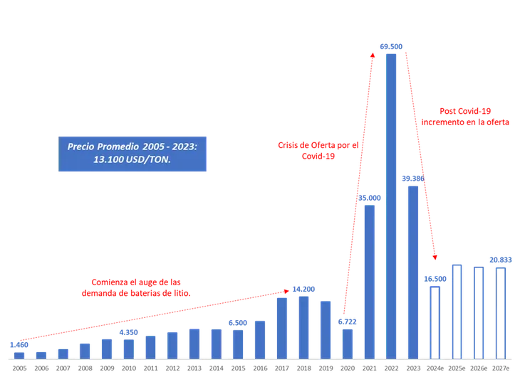 Para 2024 se estima un promedio final de u$s16.500 por tonelada, aunque en el mercado spot hoy cotiza a unos u$s12.000. Para el período 2025-2027 rondarían los u$s20.800 por tonelada, lo que los ubica un 53% por encima del promedio 2005-2023.